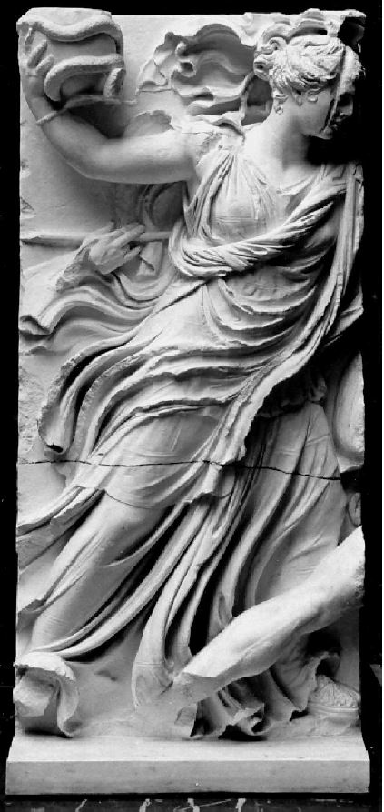 Wir besitzen Abgüsse nach drei Platten des 2,30 m hohen und 120 m langen Gigantomachiefrieses. Auf zweien ist die auf einem Pferd reitende Göttin Eos, auf der dritten eine weitere weibliche Figur (Nyx?), die ein schlangenumwundenes Gefäß nach ihrem Gegner schleudert, dargestellt.