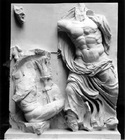 Die abgebildeten, als Abgüsse in unserer Sammlung vertretenen Skulpturen schmückten einst das Hauptwerk der Pergamenischen Kunst, den Großen Altar. Dessen Fundamente können noch heute auf einer Terrasse des Burgbergs von Pergamon besichtigt werden. Die Reliefs, vollplastische Figuren und eine Anzahl von Architekturteilen, die in byzantinischer Zeit größtenteils verbaut worden waren, gelangten im letzten Viertel des 19. Jh. nach Berlin, wo der Altar zum Teil rekonstruiert wurde.