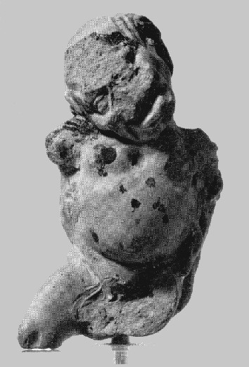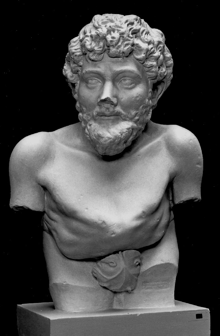 Betrachten wir zunächst den Körper eingehender. Von den Armen und Beinen der Figur sind nur Ansätze vorhanden. Sie sind an der Vorlage unseres Abgusses, dem Exemplar der Villa Albani, mit Gips verschmiert, so dass sich nicht sicher entscheiden läßt, ob in der Antike mehr vorhanden war. Wenn der heutige Bestand (die linke Schulter, ein Teil des Hinterkopfes, die Nase sowie das Feigenblatt vor dem Genital sind ergänzt) den antiken Zustand wiedergibt, so muss dieser auf den römischen Kopisten zurückgehen. Das vorauszusetzende griechische Original muss meines Erachtens den vollständigen Körper wiedergegeben haben. Freilich dürfte sich der Gesamteindruck durch die schwächlichen Gliedmaßen nicht deutlich unterschieden haben. Die Hauptaussage liegt ohne Zweifel im verkrüppelten Oberkörper.