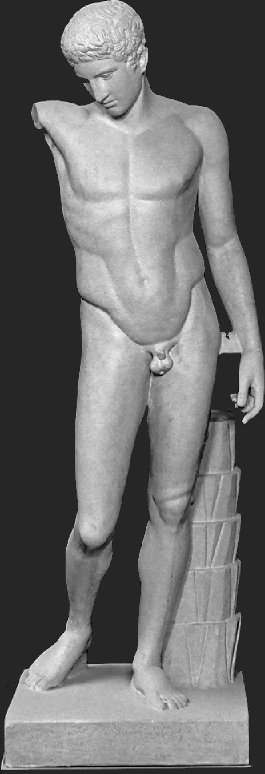 Die Abgüsse geben Wiederholungen einer in römischer Zeit sehr beliebten Knabenstatue wieder, die heute meist nach der Replik in London als „Ephebe Westmacott“, nach einer Siegerstatue aus Olympia seltener auch als „Kyniskos“ (s.u.) bezeichnet wird. Das griechische Bronzeoriginal, welches diese Statuen kopieren, dürfte von Polyklet oder einem seiner Schüler stammen. Die Lebensgröße von ca. 1,50 m, der schlanke, noch wenig muskulöse Körper und das fehlende Schamhaar lassen den Epheben, d.h. die Altersstufe von 16 bis 18 Jahren erkennen.