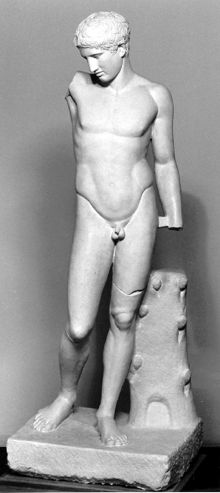 Die Autorschaft Polyklets für das Original wird heute kaum mehr diskutiert (vgl. noch Alscher). Der konsequent durchgeführte kontrapostische Aufbau des Epheben folgt den gleichen Prinzipien wie der des Doryphoros (s. Abguß Inv. 368; 277; 660): Stand- und Spielbein sind markant unterschieden, jede daraus resultierende Anspannung eines Körperteils wird mit der Entspannung des gegenüberliegenden beantwortet, jede Bewegung mit einer Gegenbewegung. Die Figur des Epheben befindet sich wie der Doryphoros oder der Diadumenos in einem labilen Gleichgewicht, das die Bewegungsfähigkeit des Körpers ausdrücken soll.