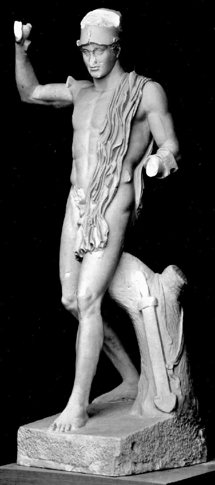 Der so gewappnete Krieger ist sonst vollkommen nackt; die über die linke Schulter gelegte Chlamys fällt als schmales Band herab, ohne den Körper zu verhüllen.