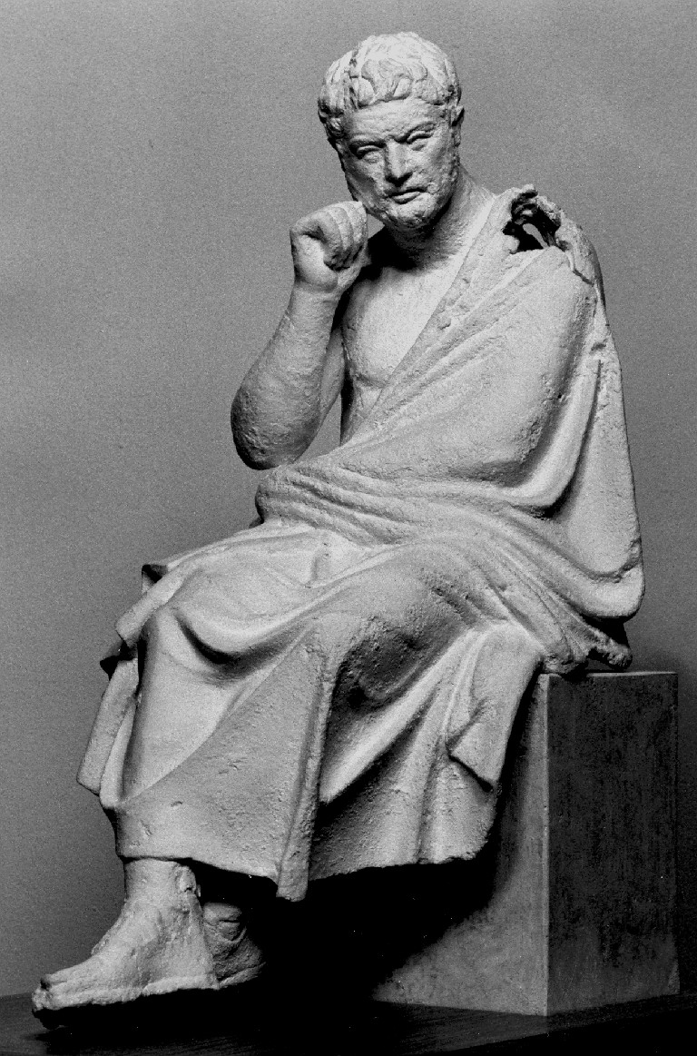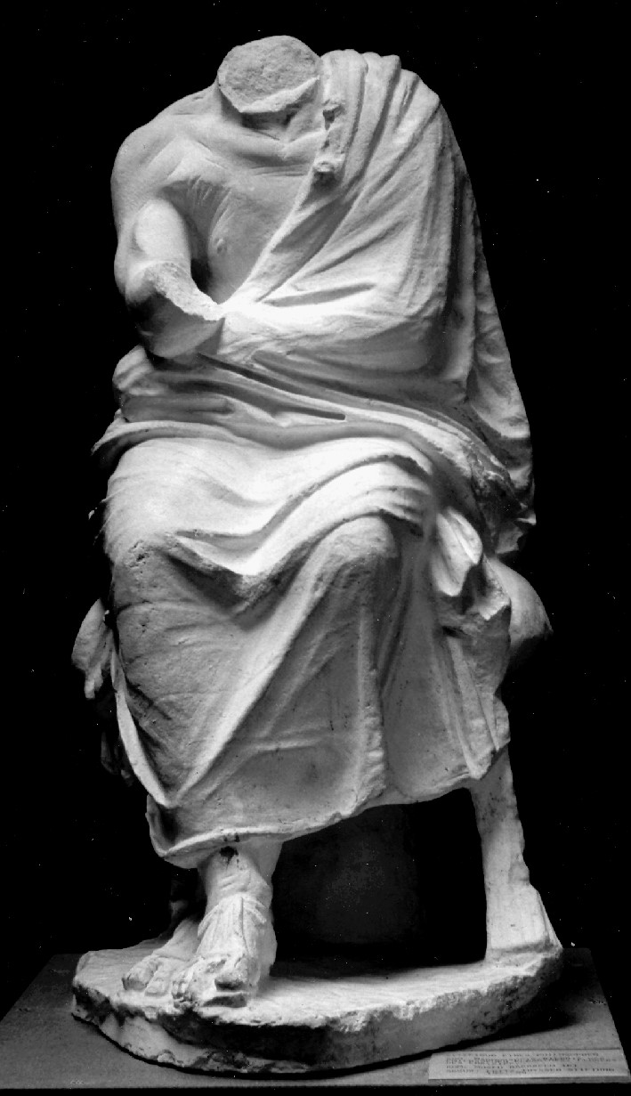 Der auf lehnlosem Stuhl mit sehr hohem Kissen sitzende Mann hat den schweren Mantel, in den er seinen linken Arm eingerollt hält, fest über die linke Hälfte des Oberkörpers gezogen. Seine abgebrochene Rechte war zum leicht geneigten und zur linken Seite gewendeten Kopf geführt, ohne diesen jedoch zu stützen; sie wurde vielmehr frei über dem Mantelsaum gehalten. Gleichzeitig erscheinen die Füße, die beide mit nahezu ganzer Sohle den Boden berühren, unruhig verschränkt. (Vgl. das Motiv mit der Statue des sogenannten Kopenhagener Dichters, Abguß Inv. 138). Daß der Philosoph in momentaner Gebärde begriffen ist, darauf lassen auch die aufrechte Sitzhaltung, die nach vorne geschobene rechte Schulter, seine in den Mantel greifende Hand sowie die angewinkelten und eben nicht entspannt zum Boden geführten Beine schließen. Zusätzlich verschärft wird dieser Eindruck erregter Beteiligung am Disput durch das fast schonungslos vorgeführte Alter des Sitzenden, die schlaff gewordene Haut mit ihren tief eingegrabenen Falten. Dieses Alter und die sich anbahnende Hinfälligkeit geradezu negierend, hat die heftige Denkanstrengung seinen gesamten Körper ergriffen.